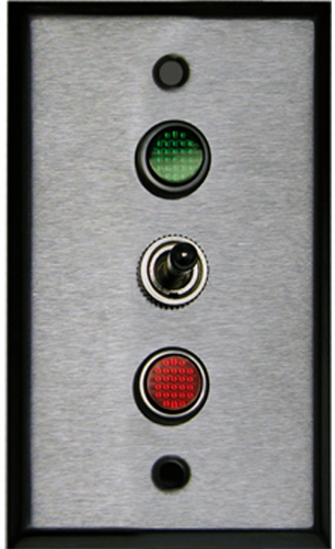 Single Gang Switch assembly with indicator lights and brushed, stainless-steel cover plate. (1) 3-position SPDT On/Off/On switch(es). Electrical box not included. Voltage: 24VDC