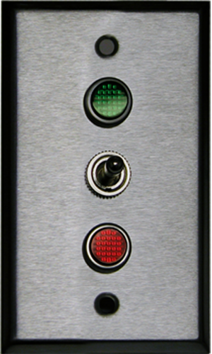 Single Gang Switch assembly with indicator lights and brushed, stainless-steel cover plate. (1) 3-position SPDT On/Off/On switch(es). Electrical box not included. Voltage: 277VAC