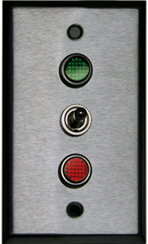 Single Gang Switch assembly with indicator lights and brushed, stainless-steel cover plate. (1) 3-position DPDT On/Off/On switch(es). Electrical box not included. Voltage: 12VDC
