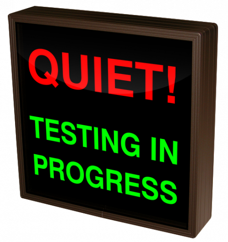 This SBL Series QUIET! TESTING IN PROGRESS indoor, blankout, LED backlit sign is designed with a matrix of energy efficient LEDs illuminating a block-style message. The sign features blankout technology that only displays the sign message when illuminated.