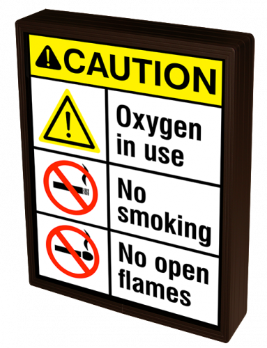 This SBLF Series Exclamation symbol CAUTION Exclamation symbol w/ Oxygen in use No Smoking Symbol No smoking No Open Flames symbol No open flames indoor, LED backlit sign features a block-style message that is readable without illumination. The message is viewable when off and can be illuminated to add emphasis to the message or to optimize readability in low light conditions.