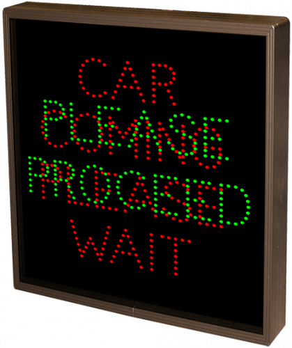This TCL Series CAR COMING PLEASE WAIT | PLEASE PROCEED (120-277VAC) outdoor, blank-out sign is designed with super bright LEDs and a contrasting face; we guarantee it's readable in direct sunlight. The sign message is formed by visible LEDs on a black sign face and is designed to illuminate the message(s) when turned on and blank out or extinguish the message when off.