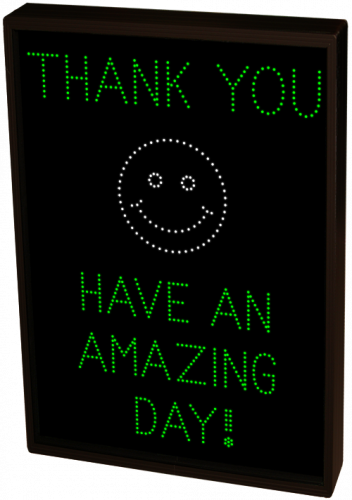 This TCL Series THANK YOU w/Smiley Face HAVE AN AMAZING DAY! outdoor, blank-out sign is designed with super bright LEDs and a contrasting face; we guarantee it's readable in direct sunlight. The sign message is formed by visible LEDs on a black sign face and is designed to illuminate the message(s) when turned on and blank out or extinguish the message when off.