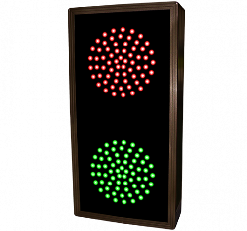 This TCL Series Indicator Dots, Double, Vertical, 4 in dia, Red - Green outdoor, blank-out sign is designed with super bright LEDs and a contrasting face; we guarantee it's readable in direct sunlight. The sign message is formed by visible LEDs on a black sign face and is designed to illuminate the message(s) when turned on and blank out or extinguish the message when off.