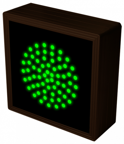This TCL Series Indicator Dot, Single with Optional Flashing, 4 in dia, Green (120-277VAC). Outdoor, blank-out sign is designed with super bright LEDs and a contrasting face; we guarantee it's readable in direct sunlight. The sign message is formed by visible LEDs on a black sign face and is designed to illuminate the message(s) when turned on and blank out or extinguish the message when off.