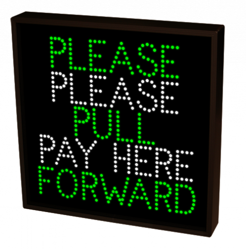 This TCL Series PLEASE PULL FORWARD | PLEASE PAY HERE (120-277VAC) outdoor, blank-out sign is designed with super bright LEDs and a contrasting face; we guarantee it's readable in direct sunlight. The sign message is formed by visible LEDs on a black sign face and is designed to illuminate the message(s) when turned on and blank out or extinguish the message when off.