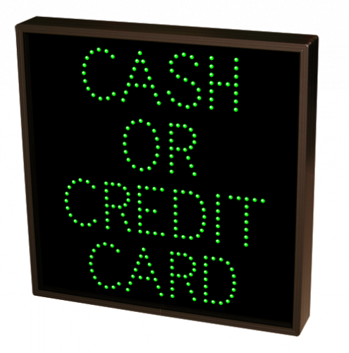 This TCL Series CASH OR CREDIT CARD (120-277VAC) outdoor, blank-out sign is designed with super bright LEDs and a contrasting face; we guarantee it's readable in direct sunlight. The sign message is formed by visible LEDs on a black sign face and is designed to illuminate the message(s) when turned on and blank out or extinguish the message when off.