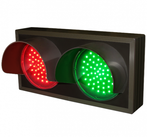 This TCL Series Indicator Dots, Double with Hoods, Horizontal, 4 in dia, Red - Green outdoor, blank-out sign is designed with super bright LEDs and a contrasting face; we guarantee it's readable in direct sunlight. The sign message is formed by visible LEDs on a black sign face and is designed to illuminate the message(s) when turned on and blank out or extinguish the message when off.