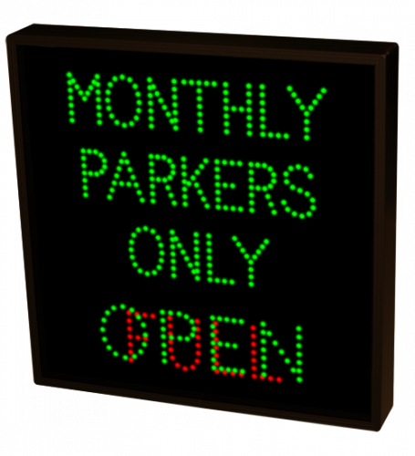 This TCL Series MONTHLY PARKERS ONLY | OPEN | FULL (120-277VAC) outdoor, blank-out sign is designed with super bright LEDs and a contrasting face; we guarantee it's readable in direct sunlight. The sign message is formed by visible LEDs on a black sign face and is designed to illuminate the message(s) when turned on and blank out or extinguish the message when off.