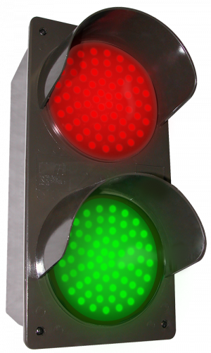 TCIL Series LED Traffic Controller - Vertical, Red-Green. Features super bright, direct-view LEDs on a replaceable circuit board. Controller housing and hood construction is injection molded, impact resistant polycarbonate. Also includes two tinted lens covers.