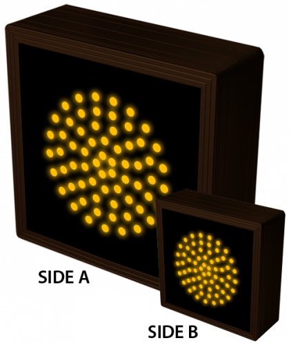 This TCL Series Indicator Dot, Single with Optional Flashing, 4 in dia, Amber, Double Face outdoor, blank-out sign is designed with super bright LEDs and a contrasting face; we guarantee it's readable in direct sunlight. The sign message is formed by visible LEDs on a black sign face and is designed to illuminate the message(s) when turned on and blank out or extinguish the message when off.