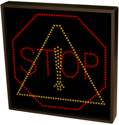 This TCL Series STOP w/ Octagon | Caution Symbol (120-277VAC) outdoor, blank-out sign is designed with super bright LEDs and a contrasting face; we guarantee it's readable in direct sunlight. The sign message is formed by visible LEDs on a black sign face and is designed to illuminate the message(s) when turned on and blank out or extinguish the message when off.