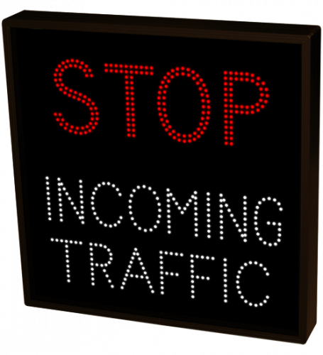 This TCL Series STOP | INCOMING TRAFFIC (120-277VAC) outdoor, blank-out sign is designed with super bright LEDs and a contrasting face; we guarantee it's readable in direct sunlight. The sign message is formed by visible LEDs on a black sign face and is designed to illuminate the message(s) when turned on and blank out or extinguish the message when off.