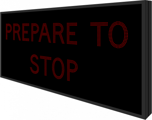 This DOT Series PREPARE TO STOP sign is a direct-view LED design that illuminates red when activated and blanks out when deactivated. Outside cabinet dimensions are 47.000" x 95.000" x 6.500".